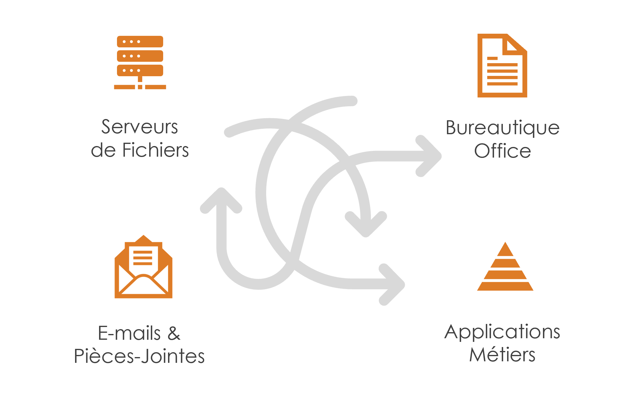 | Contenus perdus/dispersés entre Serveur de Fichiers, Messageries, PC, Tablettes, etc. | Accès Unique à TOUS ses Documents de travail via une connexion sécurisée | |