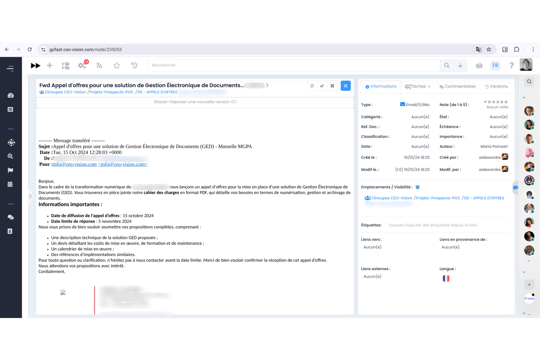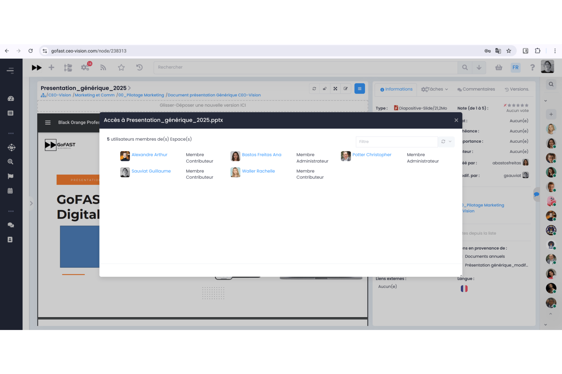 - Faciliter la conformité RGPD : les métiers gèrent les membres des espaces et donc les accès aux documents, peuvent mettre l'importance "Données Personnelles", etc.